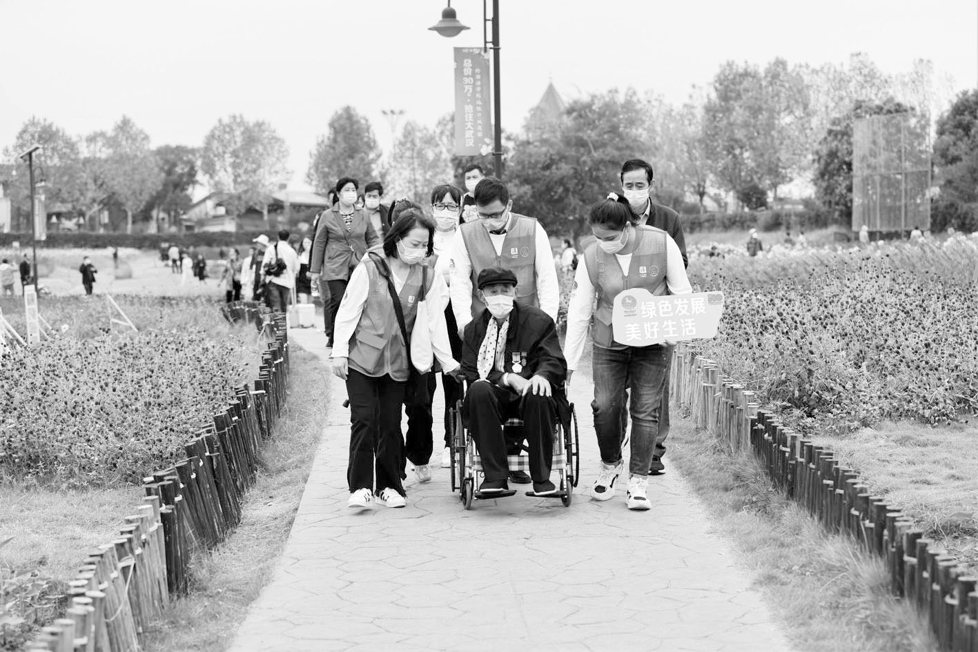 今年重阳节,为了向退役老兵致敬,武汉文旅志愿者服务总队举办了“我们的节日·重阳——九九重阳、致敬老兵”关爱退役军人志愿服务活动。在文旅志愿者及老兵家人的护送和陪伴下,89岁高龄的抗美援朝英雄吴克权首次来到武汉知名的花博汇景区,畅游花海、观看皮影戏。这次出游,吴克权郑重地将两枚抗美援朝纪念章佩戴在胸前。参观过程中,文旅志愿者一边推着轮椅,一边为老人讲解景区的植物品种和文化景观。伴随着文旅志愿者的悉心照料,吴克权与家人在缤纷花海里享受着幸福美好的时光。