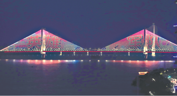 长江日报记者在汉口江滩看到,随着夜幕降临,以两江四岸的建筑、桥体、山体以及趸船码头为恢宏幕布,绚烂光影铺陈水天一色,以动感的画面勾勒出江城大美夜色。