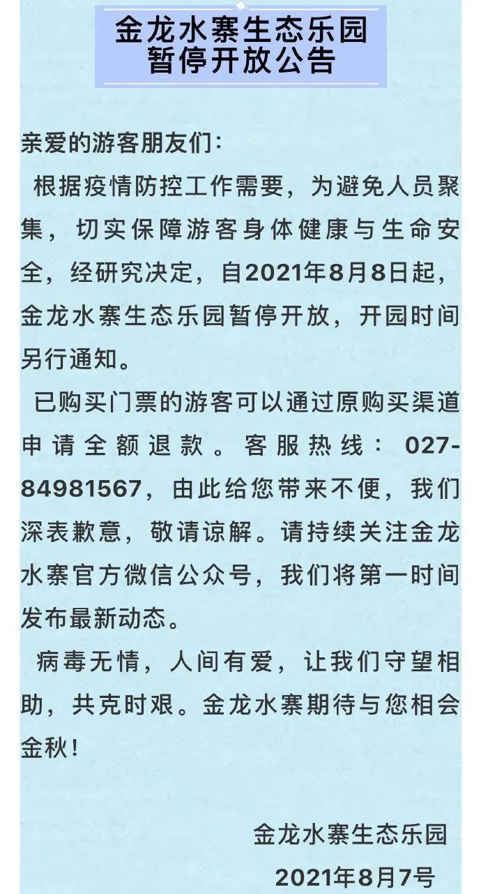 “选择暂时闭园既是响应政府防疫政策,减轻防控工作压力,也能降低景区运行成本压力。”金龙水寨景区相关负责人介绍,该景区从8日开始暂停开放,已购买门票的游客可以通过原购买渠道申请全额退款。