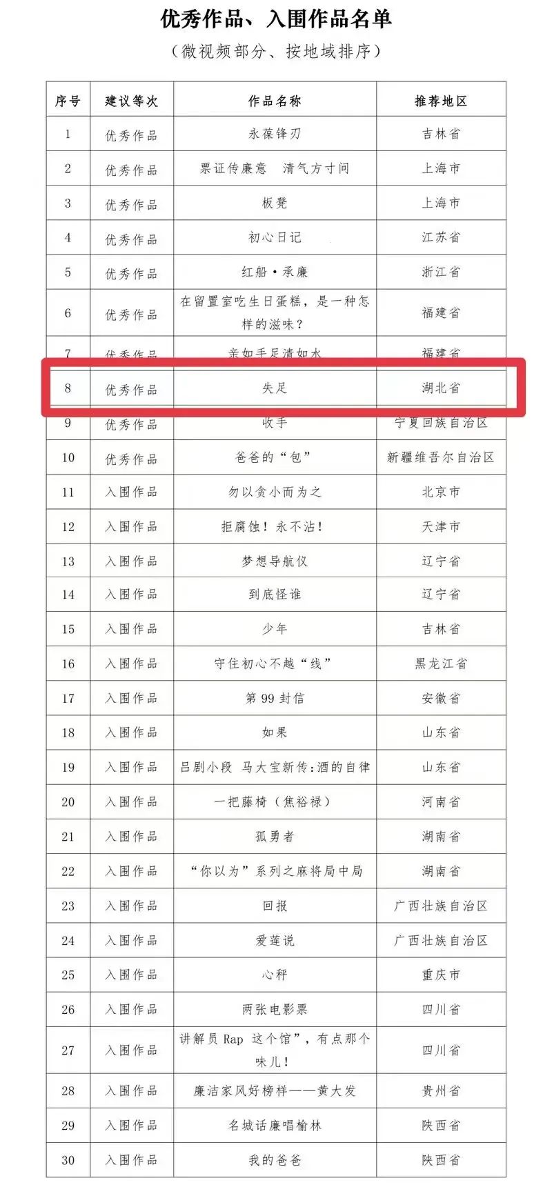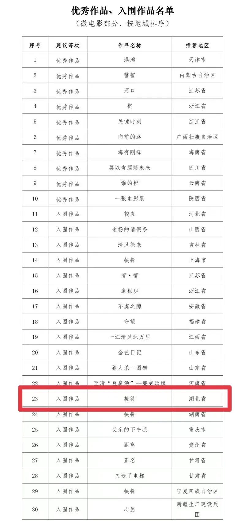 近日,由中央纪委国家监委宣传部、中央网信办网络传播局、中国文联国内联络部联合主办,人民网承办的廉洁文化微电影微视频征集展播,公布了优秀作品、入围作品名单(名单附后),共有30部微电影和30部微视频作品入围,其中由武汉市纪委监委选送的微视频《失足》入选优秀作品,微电影《接待》入选入围作品。微电影《接待》由市纪委监委派驻市文旅局纪检监察组组织报送、武汉说唱团制作拍摄。《港湾》《警誓》等10部微电影、《永葆锋刃》《票证传廉意 清气方寸间》等10部微视频将通过人民网等媒体进行展播。