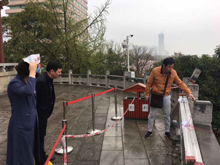三月春暖花开,正值旅游旺季,晴川阁日游客接待量突破1万人次。为缓解大量游客为景区带来的安全隐患,领导班子带队对全园进行了全覆盖式安全大排查。经排查,晴川阁主楼平台前栏杆有断裂迹象。为避免游客倚靠造成安全事故,立即责成专业维修人员进行了现场维修,并增设安全警示标志,保障游客出行安全,营造良好的旅游环境。为进一步提升旅游安全保障服务,馆领导强调,要对园区正在施工区域设置警戒线,规划好游客行走路线,避开施工现场,加强工作人员日常巡查,并做好巡查记录。