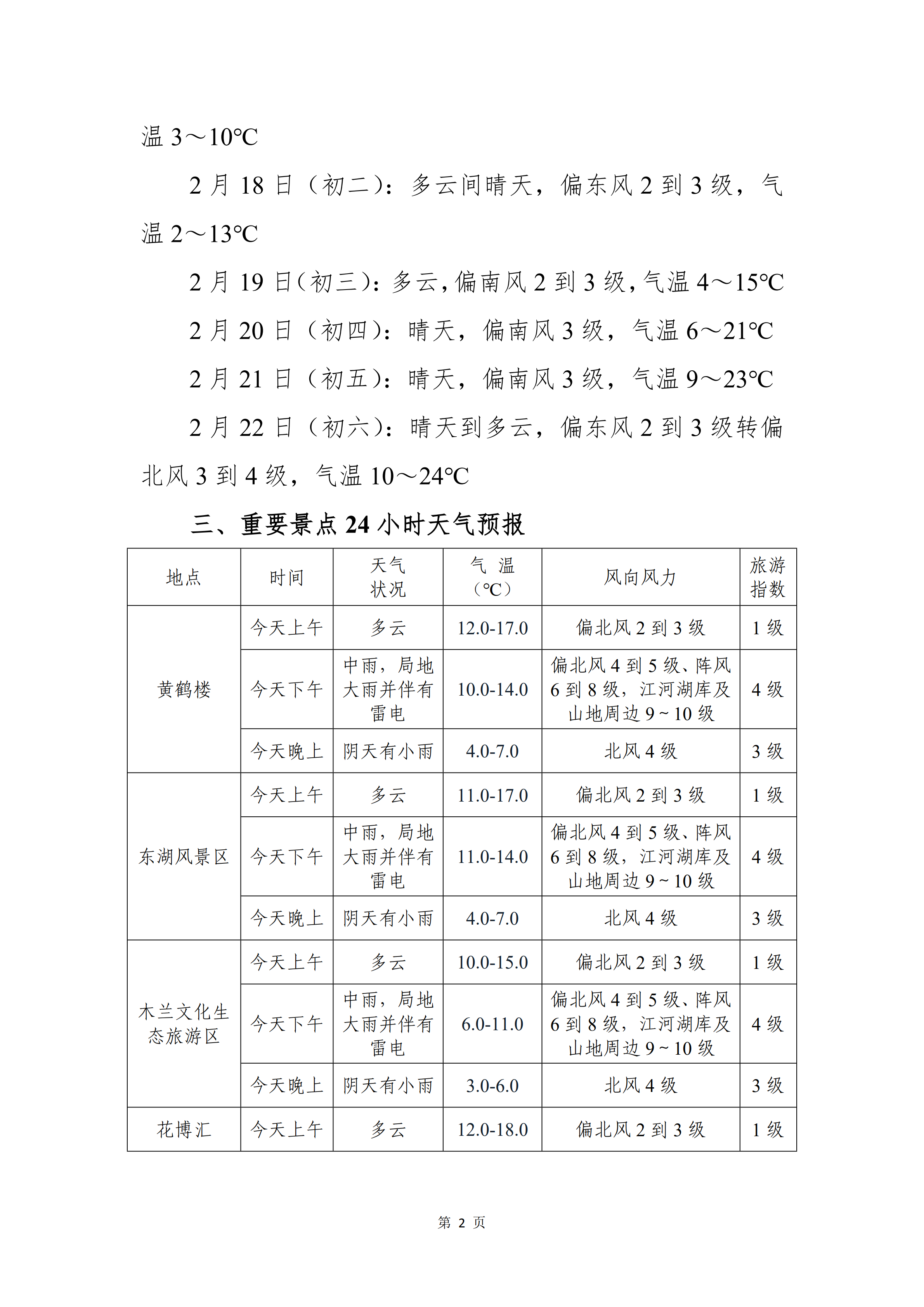 旅游气象服务专报(2026年02月15日)