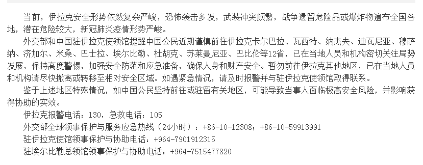 提醒中国公民近期谨慎前往伊拉克卡尔巴拉、瓦西特等12省暂勿前往伊拉克其他地区