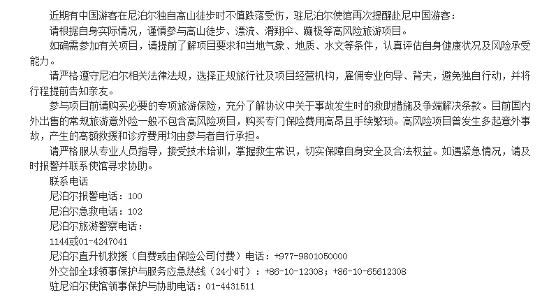 驻尼泊尔使馆提醒赴尼中国游客谨慎参与高风险旅游项目