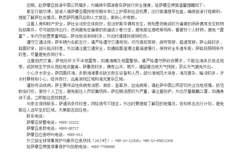 驻萨摩亚使馆提醒中国公民注意旅行安全