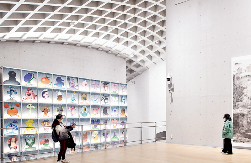 在武汉美术馆(琴台馆)展出的是双年展“文化样态”“城市形态”“创新动态”三个专题。1月1日一开馆,就有市民来到唐晖的巨幅拼贴作品《Cyberbobo》前拍照,这件作品由数十幅面孔组成,涉及全球热门的区块链、元宇宙话题,格外受到观众喜爱。加上照片墙的一侧是美术馆内的“网红”纯黑旋转楼梯,因此这个空间,也成了观众最喜欢的打卡地之一。