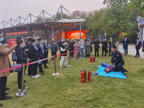 17日下午,武汉市文化和旅游局在黄陂区木兰水镇景区召开了全市A级旅游景区安全生产及疫情防控工作推进现场会,举办了2021年消防安全进景区暨A级旅游景区反恐宣教活动。