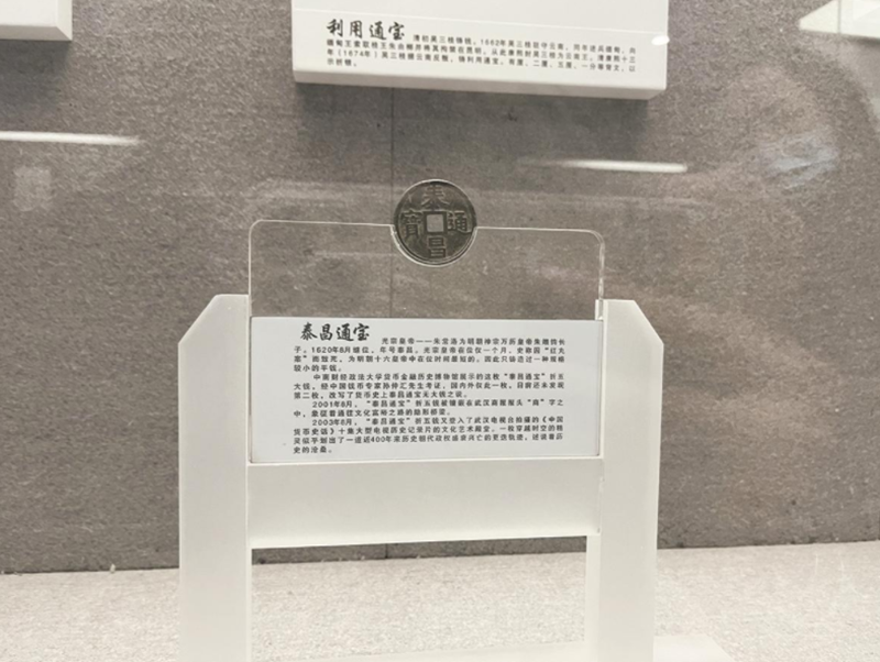 明朝货币展区藏有该馆的镇馆之宝——泰昌通宝折五钱。其外形为圆形,中间有正方形孔,币上铸有“泰昌通宝”四个字。“经中国钱币专家孙仲汇先生考证,我馆展出的这枚钱币迄今为止全世界只有这一枚,是海内外孤品。泰昌通宝折五钱的出现,改写了货币史上泰昌年间无大钱的说法,填补了一项学术上的空白。”黄丽说。