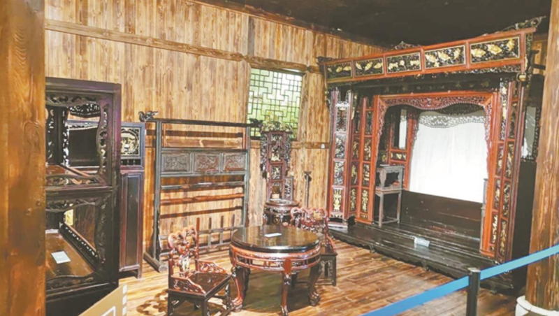 土家族展厅里的三滴水床,是清代原件,1988年从湘西永顺收集而来,也是镇馆之宝之一。滴水床是土家族的婚床,借鉴屋檐滴水之意,实际是层进式结构,三滴水床意思是三层进的床。另一种解释是指土家姑娘出嫁时,要坐在床上哭嫁,取泪水滴答之意,故叫“滴水床”。