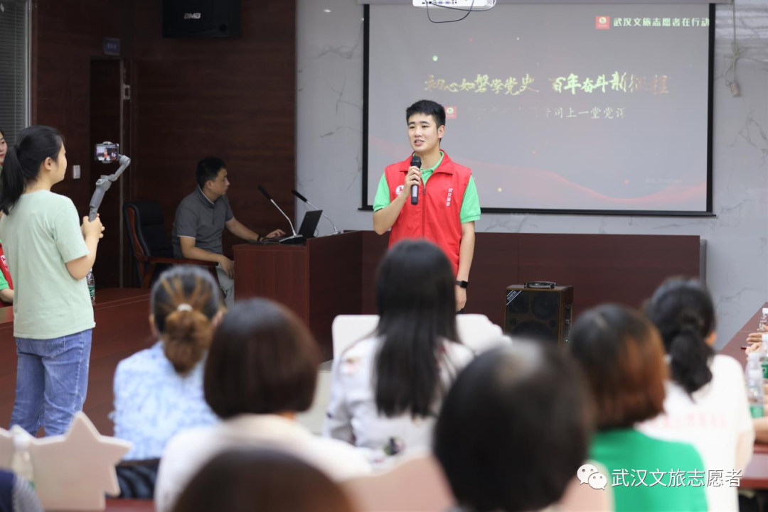 同时创新“党课宣讲+志愿服务”模式,将党史学习成果转化到志愿服务的实际行动中,带着“行走的党课”深入武汉各大景区、社区、校园,以实景党课的形式,引导游客重温红色景点,将党史学习教育宣讲活动常态化。
