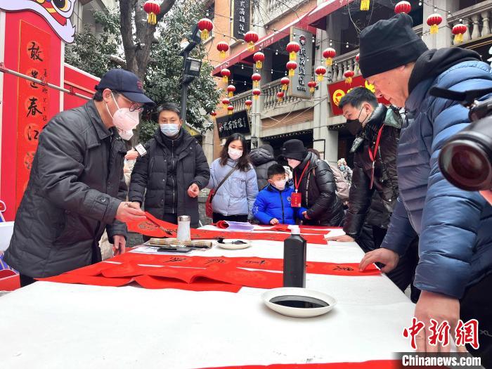 中新网武汉1月15日电 (记者 张芹)看演出、逛市集、品美食……2023“年味武汉”吉庆民俗迎春文化活动15日下午在江岸区吉庆街开启。活动现场,书法家、民间剪纸艺术家书写春联、“福”字、剪窗花赠送给市民、游客。