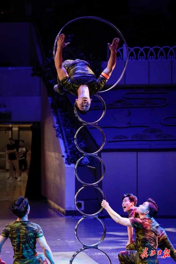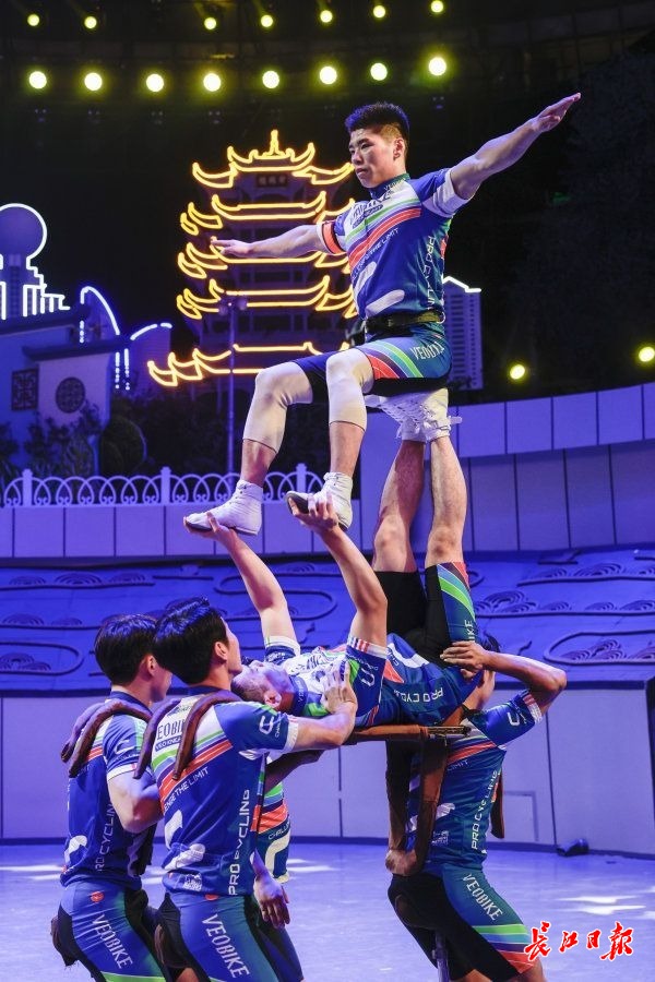 在26日下午举行的首场竞演中,来自武汉杂技团的陈通、梁硕、鲁国祥、陈婧旋四位“00后”杂技演员集体亮相,带来《钻圈》《大跳板》《扬帆追梦·浪船》《飞轮炫技》《独轮车技》《集体车技》等多个精彩的节目,不仅涵盖了高空、地面等多种类型,更展示了武汉杂技在大型集体节目中的实力。武汉杂技团副团长陈健介绍,这场竞演节目的含金量一点也不弱于国际比赛,“比如《钻圈》中钻7个圈的表演是国内的最高纪录;《大跳板》中的‘侧空翻三周转体’、《扬帆追梦·浪船》中‘团身三周落桥’的动作,这些技巧在国际上都少见,也是武汉团的‘独一份儿’。”