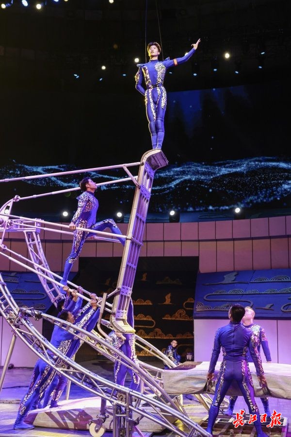 武汉杂技团青年演员鲁国祥(上)表演《扬帆追梦:浪船》。