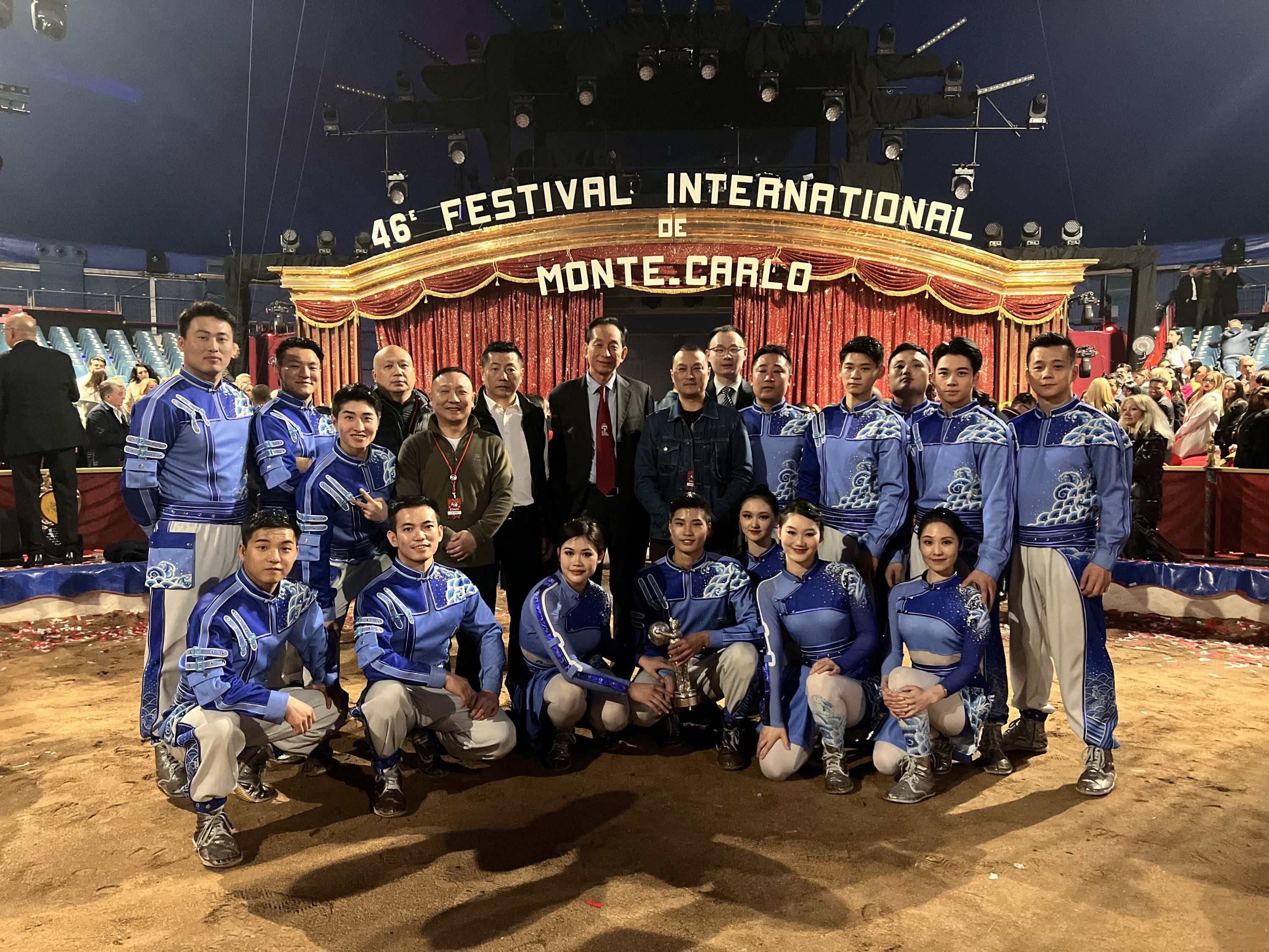 武汉杂技团《扬帆追梦·浪船》演员(前排蓝色服装)在蒙特卡洛国际马戏节颁奖礼上。 武汉杂技团供图