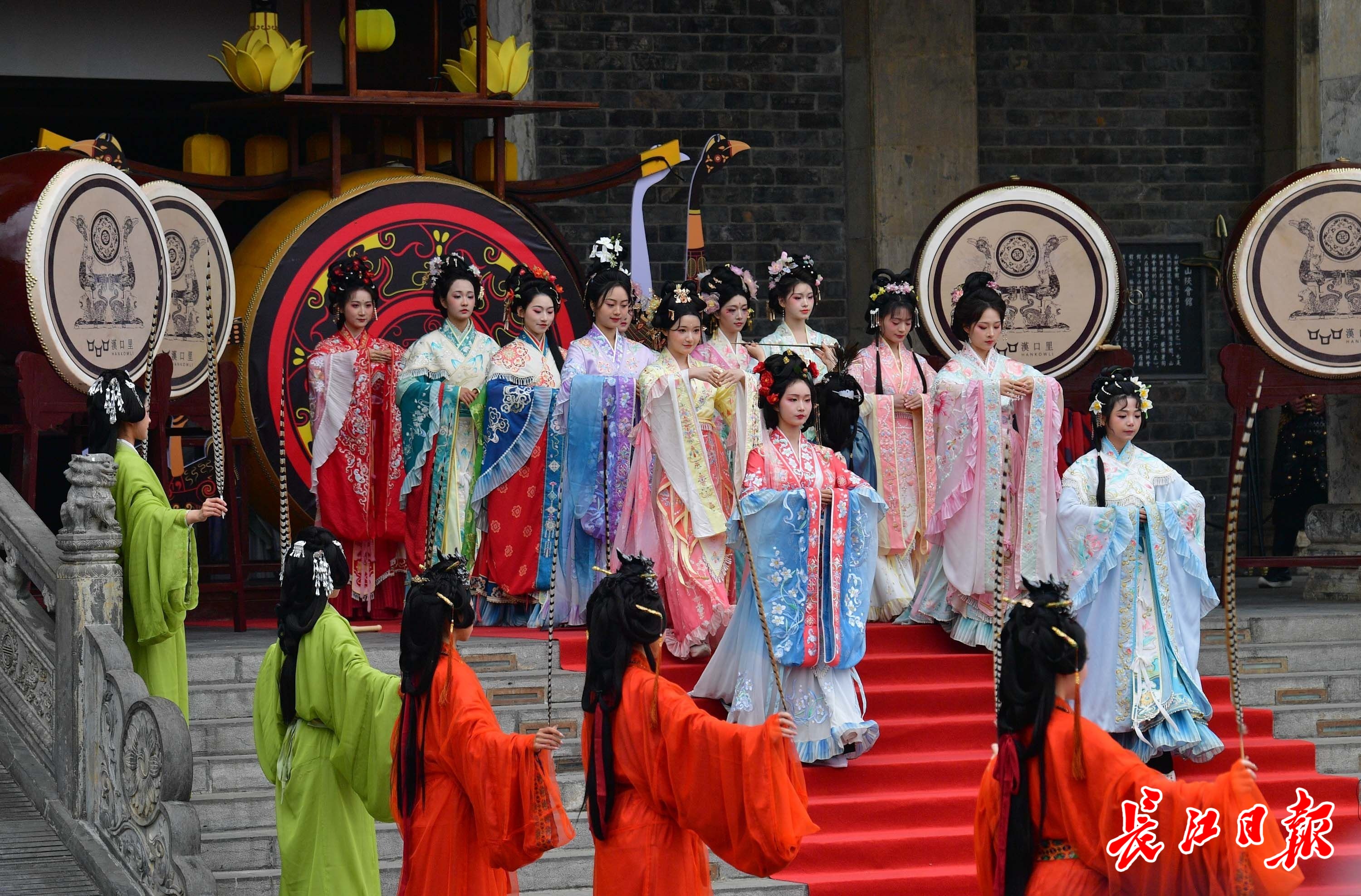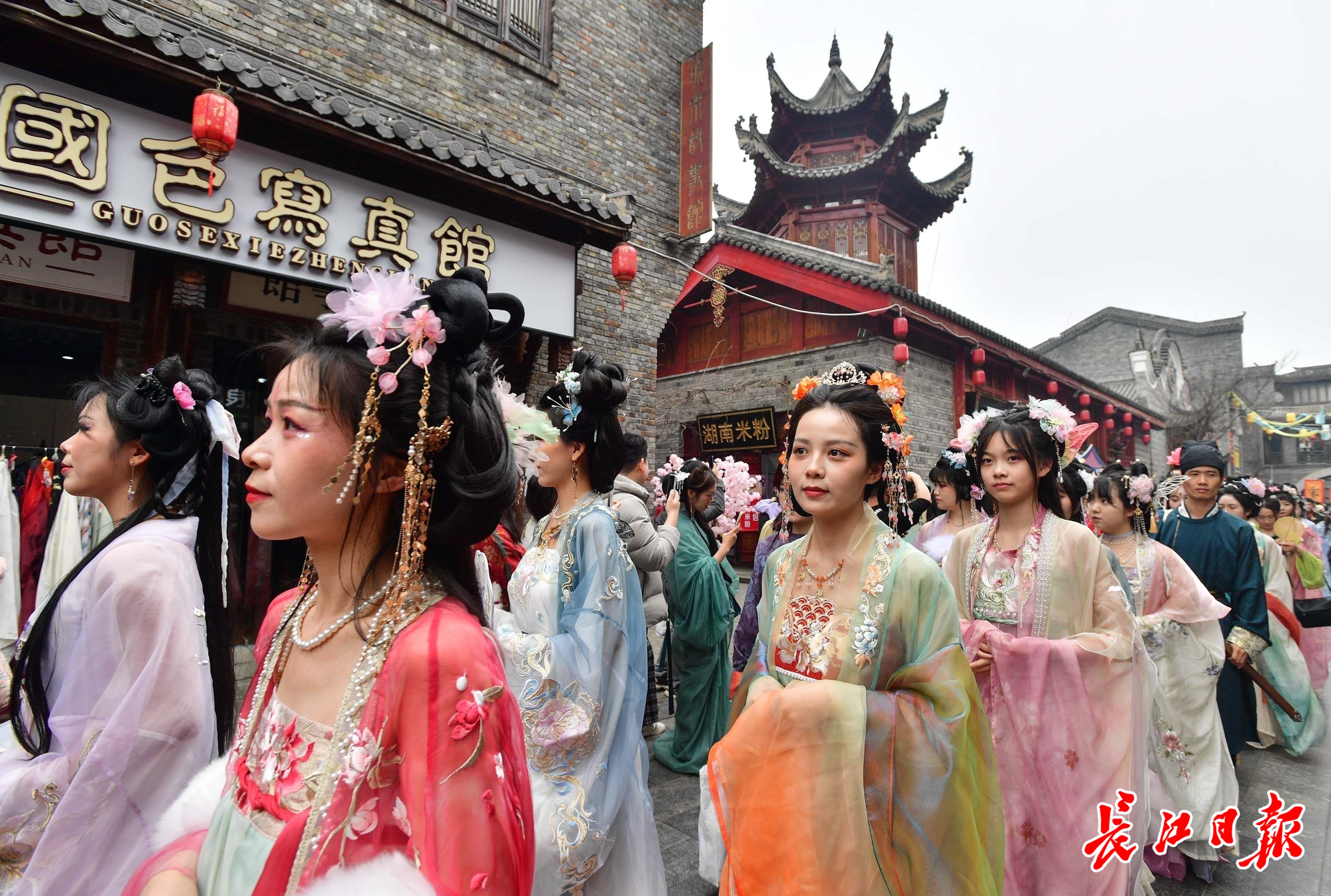 汉服巡游是花朝节最吸睛活动。来自湖北大学、长江大学、华中师范大学、武昌职业学院、武汉纺织大学等武汉地区20余所高校华服社团,千余人或穿甲胄、战国袍等样式,或着魏晋、唐、宋、明等朝代服饰,列队穿行古色古香的汉口里,吸引不少路人拍照观看。