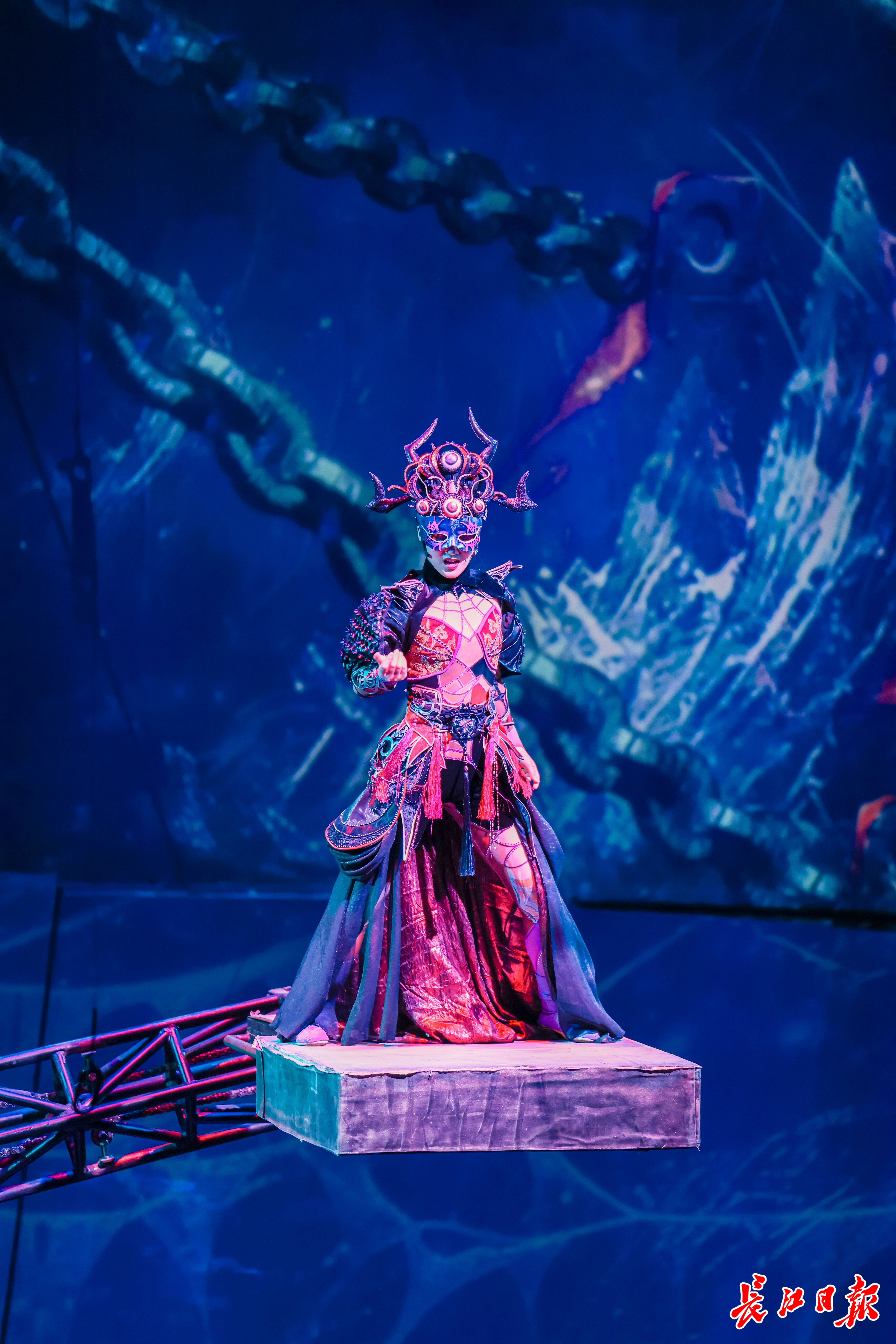 “杂技是不断突破人体极限的艺术,它呈现出来的那种上下求索、不畏艰辛的拼搏精神,也是荆楚文化的精神内涵和特征。所以我们在剧中不仅体现了大江大泽、屈原的求索、山海经的瑰丽,还用长江流域特有的金丝猴、秋沙鸭等五种动物和剧中的‘凤凰五德’结合起来,最终形成了小青鸟在和他们的互动中学习、成长,带领大家战胜黑暗,找到光明的主线。”杨嵘说。