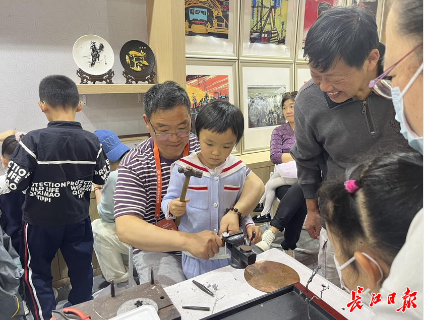 不少特色非遗让小朋友着迷。在天门纸花制作技艺展位前,一大群小朋友和他们的父母围在纸花周围,纸花在传承人手中不停地变换花样,如同玩魔术,小朋友们瞪大了眼睛,追问纸花怎么玩。在芜湖铁画锻制技艺展位上,一名小女孩干脆坐到了传承人的位置,在传承人手把手的指导下,挥起了铁锤,将白铁打平。然后传承人用工具将白铁掰弯,弯成一个个花瓣,不一会,一朵白铁梅花就成型了。
