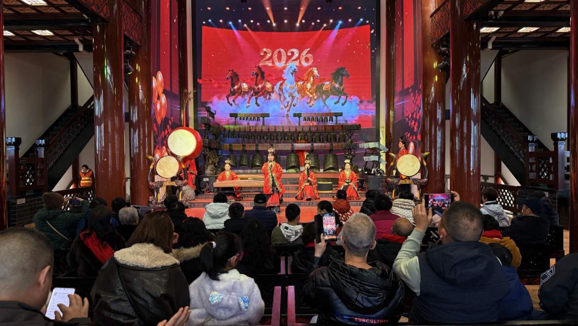 “咚——”随着一声浑厚的编钟鸣响,《楚商》《橘颂》等经典曲目接连奏响,乐声时而雄浑激昂,如万马奔腾;时而婉转悠扬,似春风拂柳。观众席上座无虚席,老人凝神聆听,孩子驻足张望,不少游客举起手机,定格下这跨越千年的文化瞬间。乐声穿堂而出,飘向磨山湖畔,与山间的欢笑声交织,成了马年最动人的荆楚雅韵。