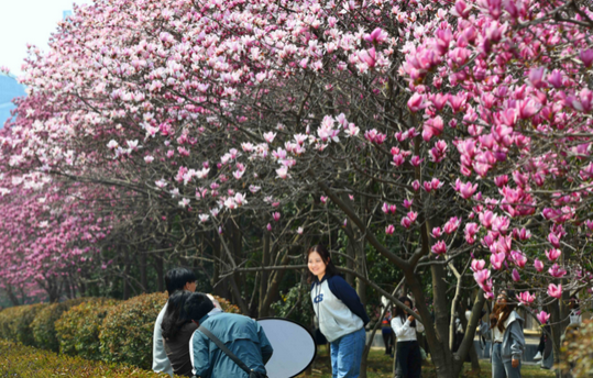 武汉植物园内80余株玉兰已陆续进入盛花期:二乔玉兰、白玉兰、宝华玉兰、紫玉兰等十余种玉兰花色丰富、花态迥异,分布在木兰园、标本馆周边、珍稀濒危植物区等。汉口江滩长春门至永清门,花多人少的玉兰花长廊别错过。青山区白玉公园百余株玉兰与园中的亭台楼阁交相辉映,古韵十足。华中科技大学“玉兰教室”窗外,花枝如瀑倾泻,成为学子们的春日限定浪漫。堤角公园、琴台绿化广场的玉兰花,花期都可持续到4月上旬。