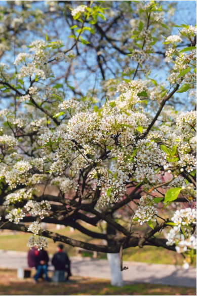 一夜春风,梨花如雪。青山公园内57岁的“梨树王”高大舒展,远望如云团悬空;硚口区华中建材市场内,一棵150年古杜梨树的花影洒落青瓦,静谧悠远;藏龙岛湿地公园的梨林则如繁星点点,清新脱俗。