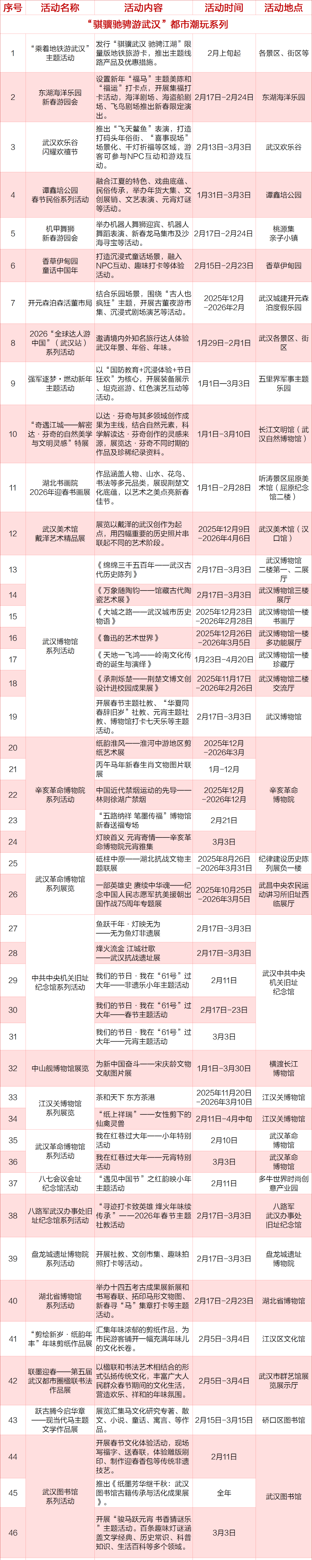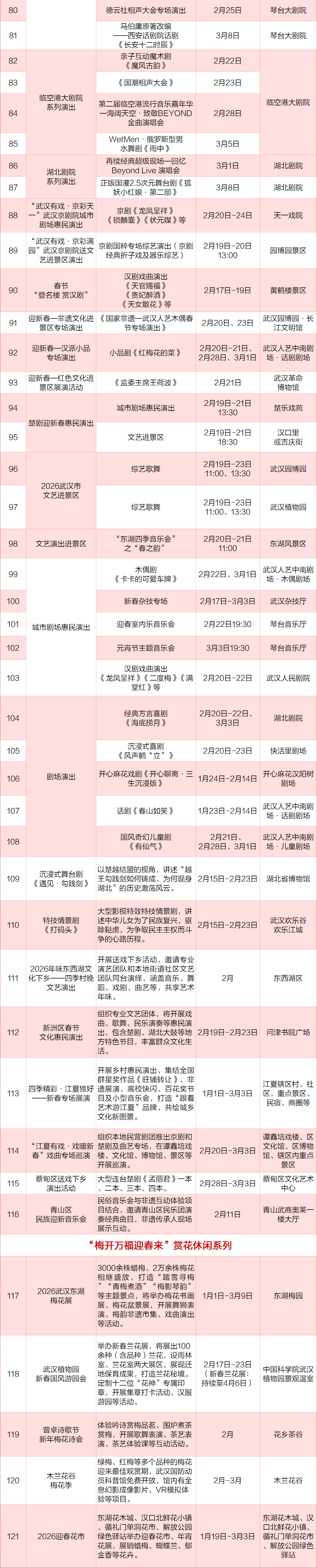 春节期间,琴台音乐厅、琴台大剧院等场馆好戏连台,春之声—中外名曲新春音乐会、西班牙格拉纳达弗拉明戈经典舞剧《歌剧魅影》等重磅演出相继亮相。2月21日大年初五,去琴台音乐厅,听武汉民谣歌手冯翔唱最地道的方言民谣。2月25日大年初九,德云社相声天团将亮相琴台大剧院,12位实力派演员说学逗唱。市直文艺院团组织“武汉有戏”文艺演出进景区、进乡村,黄鹤楼、园博园等景区的专场演出,以及送戏下乡、四季村晚等惠民活动,让文化年味浸润全城。各文博场馆也推出系列主题展,其中武汉博物馆《十五物・一座城——武汉城市历史文物特展》精选十五件(套)代表性出土文物,镇馆之宝《江汉揽胜图》惊艳亮相,邀市民游客探寻江城历史文脉。