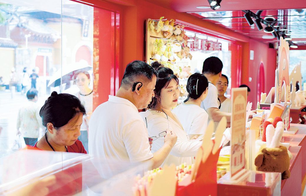 10月4日14时许,长江日报记者在武汉礼物X汉阳造物旗舰店现场看到,市民游客在店内选购心仪文创,“蒜鸟、蒜鸟”的声音不绝于耳,各式带有谐音梗、吉利话的摆件、冰箱贴等成为游客抢购的香饽饽。数据显示,该店在武汉礼物全市门店中销量连续四天排名第一。