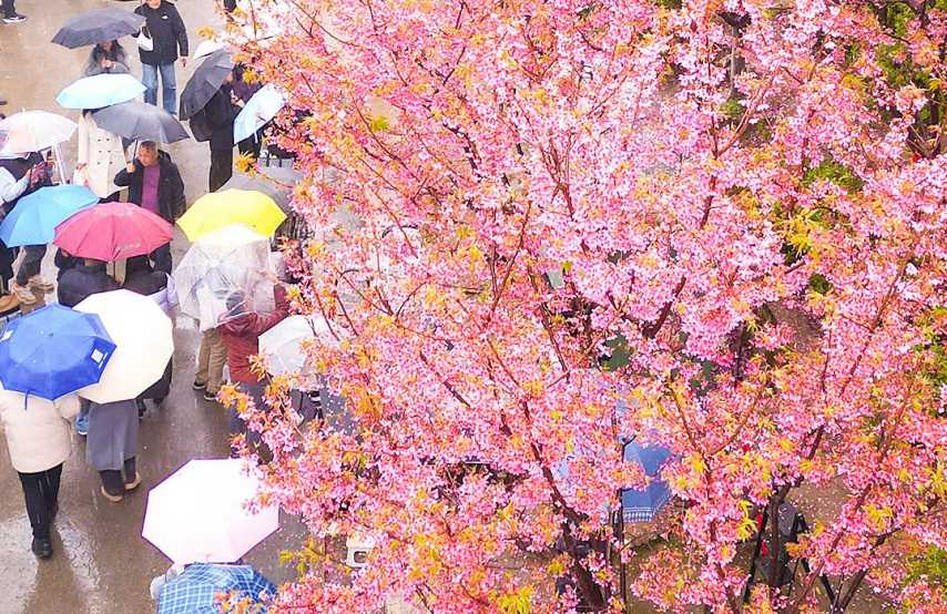 3月15日,市民和游客撑伞漫步在汉阳龟山樱花坡上,雨中赏 樱别有一番风情。